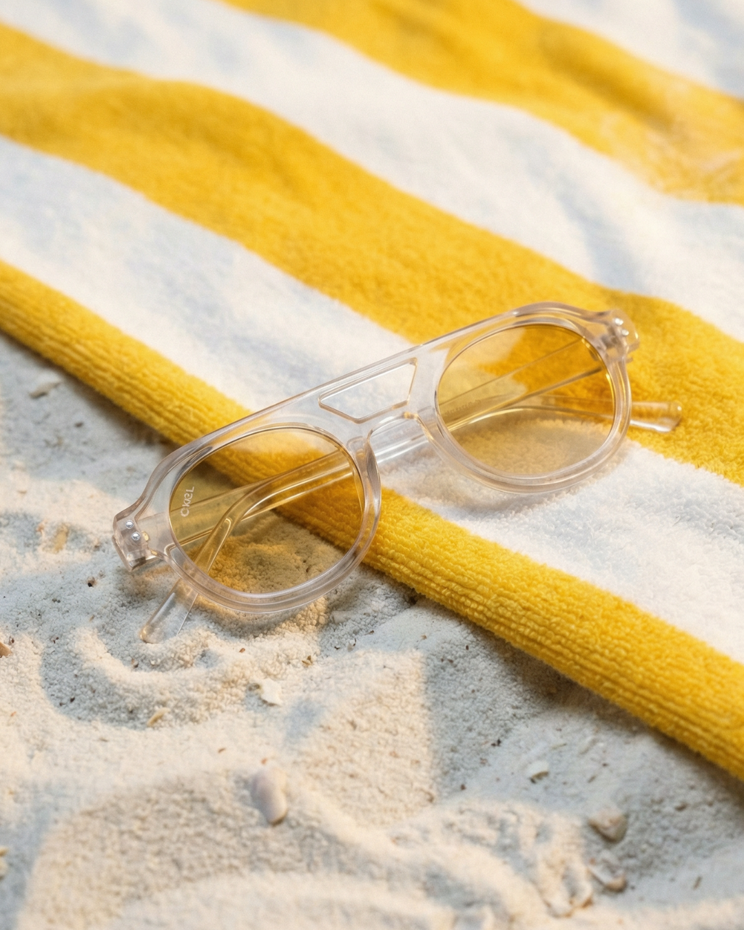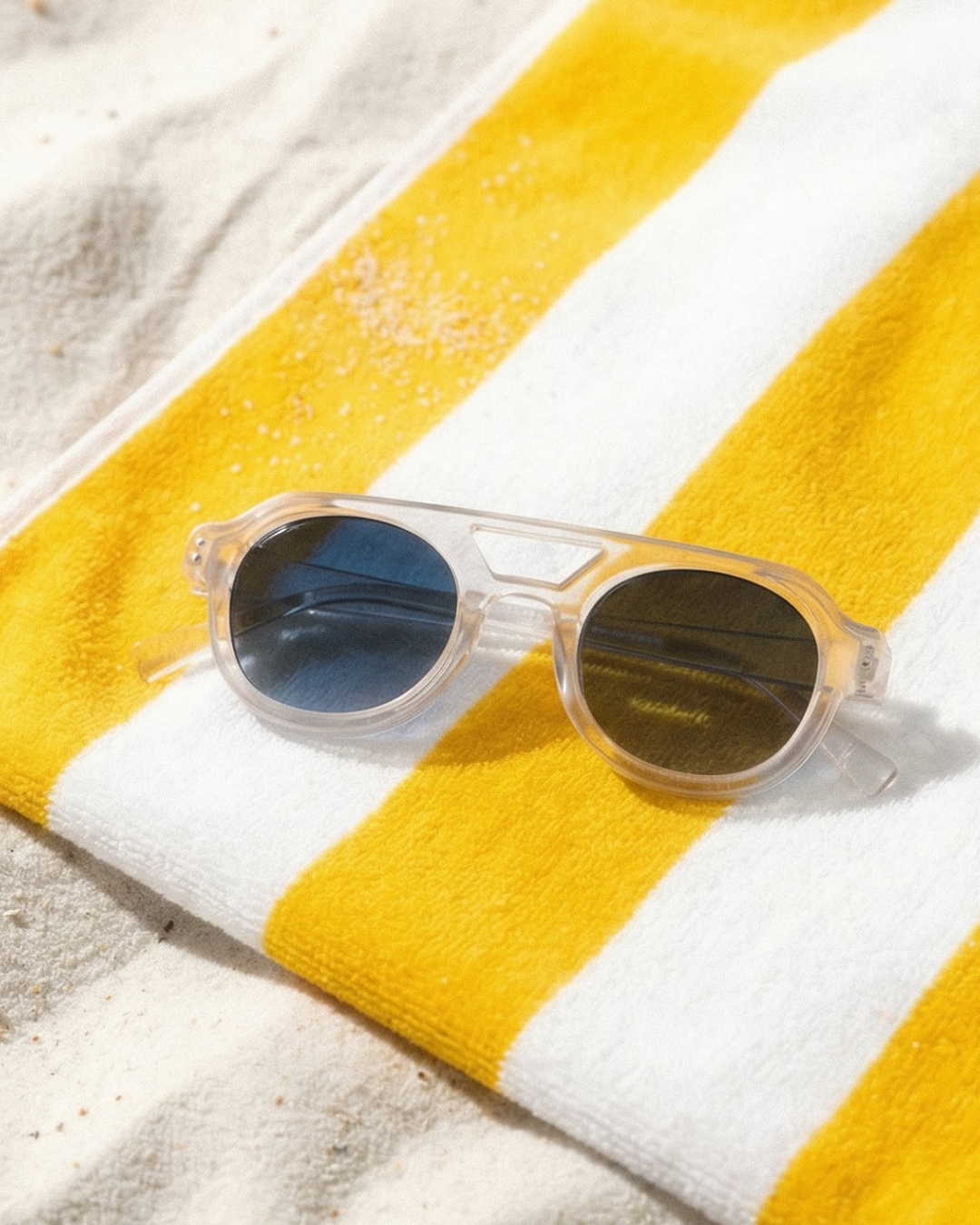 Monture ronde esprit aviateur, légère mais affirmée, avec une épaisseur subtilement travaillée. Un clin d’œil rétro tout droit sorti d’un été marseillais.