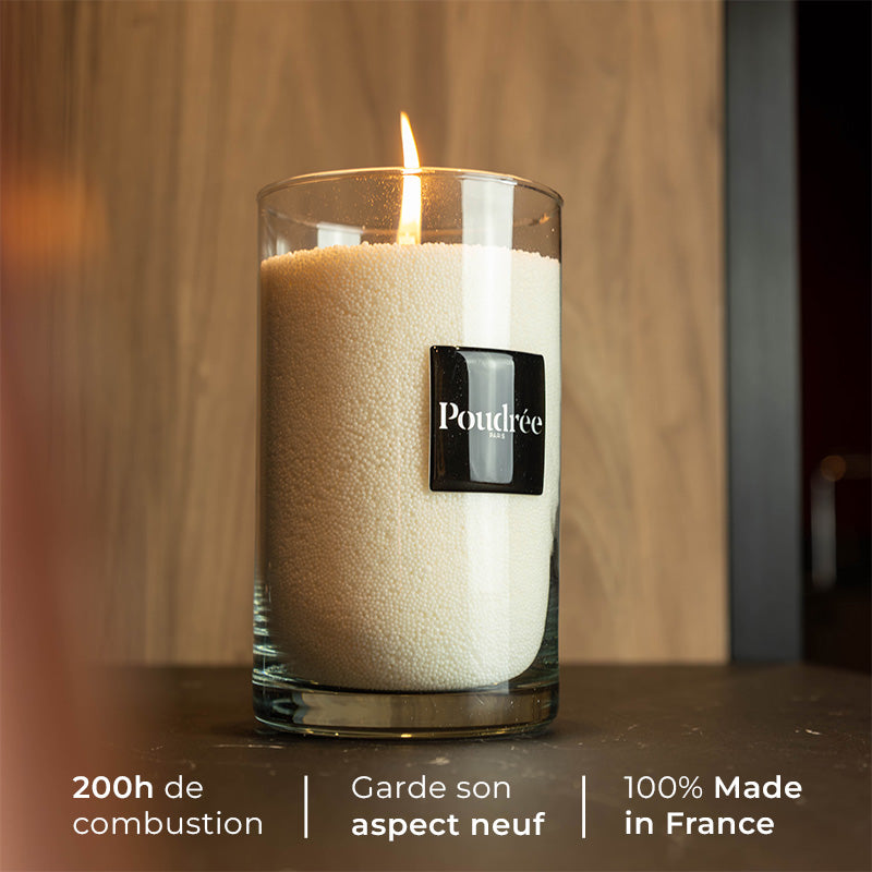 Les bougies parfumées de Poudrée Paris allient innovation, respect de l'environnement et savoir-faire. Elles sont testées et fabriquées France. Poudrée transforme vos contenants préférés en bougies uniques, 100% végétales et sans substances toxiques. Zéro gaspillage : on recharge, on réutilise, on sublime. Résultat : une flamme douce, une senteur raffinée, et un intérieur plus responsable et sain.